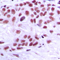 Immunohistochemical analysis of TRAP220 staining in human breast cancer formalin fixed paraffin embedded tissue section. The section was pre-treated using heat mediated antigen retrieval with sodium citrate buffer (pH 6.0). The section was then incubated with the antibody at room temperature and detected using an HRP conjugated compact polymer system. DAB was used as the chromogen. The section was then counterstained with haematoxylin and mounted with DPX. -