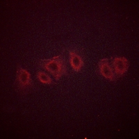 Immunofluorescent analysis of PPP2CA (Phospho-Y307) staining in A549 cells. Formalin-fixed cells were permeabilized with 0.1% Triton X-100 in TBS for 5-10 minutes and blocked with 3% BSA-PBS for 30 minutes at room temperature. Cells were probed with the primary antibody in 3% BSA-PBS and incubated overnight at 4 °C in a hidified chamber. Cells were washed with PBST and incubated with a AF594-conjugated secondary antibody (red) in PBS at room temperature in the dark.
