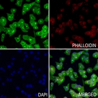 Immunofluorescent analysis of AMPK gamma 1 staining in PANC1 cells. Formalin-fixed cells were permeabilized with 0.1% Triton X-100 in TBS for 5-10 minutes and blocked with 3% BSA-PBS for 30 minutes at room temperature. Cells were probed with the primary antibody in 3% BSA-PBS and incubated overnight at 4 °C in a hidified chamber. Cells were washed with PBST and incubated with a AF488-conjugated secondary antibody (green) in PBS at room temperature in the dark. Phalloidin - AF594 was used to stain Actin filaments (red). DAPI was used to stain the cell nuclei (blue).
