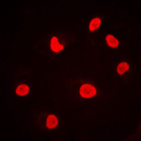 Immunofluorescent analysis of DNA-PKcs staining in MCF7 cells. Formalin-fixed cells were permeabilized with 0.1% Triton X-100 in TBS for 5-10 minutes and blocked with 3% BSA-PBS for 30 minutes at room temperature. Cells were probed with the primary antibody in 3% BSA-PBS and incubated overnight at 4 °C in a humidified chamber. Cells were washed with PBST and incubated with a DyLight 594-conjugated secondary antibody (red) in PBS at room temperature in the dark.