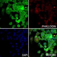 Immunofluorescent analysis of ERK1/2 staining in PANC1 cells. Formalin-fixed cells were permeabilized with 0.1% Triton X-100 in TBS for 5-10 minutes and blocked with 3% BSA-PBS for 30 minutes at room temperature. Cells were probed with the primary antibody in 3% BSA-PBS and incubated overnight at 4 °C in a hidified chamber. Cells were washed with PBST and incubated with a AF488-conjugated secondary antibody (green) in PBS at room temperature in the dark. Phalloidin - AF594 was used to stain Actin filaments (red). DAPI was used to stain the cell nuclei (blue).