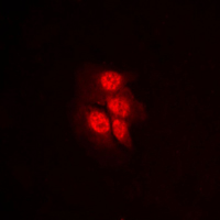 Immunofluorescent analysis of MKK1 (Phospho-T292) staining in HeLa cells. Formalin-fixed cells were permeabilized with 0.1% Triton X-100 in TBS for 5-10 minutes and blocked with 3% BSA-PBS for 30 minutes at room temperature. Cells were probed with the primary antibody in 3% BSA-PBS and incubated overnight at 4 °C in a humidified chamber. Cells were washed with PBST and incubated with a DyLight 594-conjugated secondary antibody (red) in PBS at room temperature in the dark.