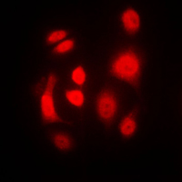 Immunofluorescent analysis of PKR staining in MCF7 cells. Formalin-fixed cells were permeabilized with 0.1% Triton X-100 in TBS for 5-10 minutes and blocked with 3% BSA-PBS for 30 minutes at room temperature. Cells were probed with the primary antibody in 3% BSA-PBS and incubated overnight at 4 °C in a humidified chamber. Cells were washed with PBST and incubated with a DyLight 594-conjugated secondary antibody (red) in PBS at room temperature in the dark.