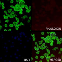 Immunofluorescent analysis of PRKX staining in PANC1 cells. Formalin-fixed cells were permeabilized with 0.1% Triton X-100 in TBS for 5-10 minutes and blocked with 3% BSA-PBS for 30 minutes at room temperature. Cells were probed with the primary antibody in 3% BSA-PBS and incubated overnight at 4 °C in a hidified chamber. Cells were washed with PBST and incubated with a AF488-conjugated secondary antibody (green) in PBS at room temperature in the dark. Phalloidin - AF594 was used to stain Actin filaments (red). DAPI was used to stain the cell nuclei (blue).