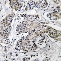 Immunohistochemical analysis of PRKX staining in human breast cancer formalin fixed paraffin embedded tissue section. The section was pre-treated using heat mediated antigen retrieval with sodium citrate buffer (pH 6.0). The section was then incubated with the antibody at room temperature and detected using an HRP conjugated compact polymer system. DAB was used as the chromogen. The section was then counterstained with haematoxylin and mounted with DPX. -