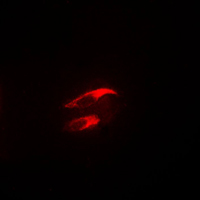 Immunofluorescent analysis of Focal Adhesion Kinase (Phospho-Y925) staining in NIH3T3 cells. Formalin-fixed cells were permeabilized with 0.1% Triton X-100 in TBS for 5-10 minutes and blocked with 3% BSA-PBS for 30 minutes at room temperature. Cells were probed with the primary antibody in 3% BSA-PBS and incubated overnight at 4 °C in a humidified chamber. Cells were washed with PBST and incubated with a DyLight 594-conjugated secondary antibody (red) in PBS at room temperature in the dark.
