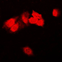 Immunofluorescent analysis of Focal Adhesion Kinase staining in HeLa cells. Formalin-fixed cells were permeabilized with 0.1% Triton X-100 in TBS for 5-10 minutes and blocked with 3% BSA-PBS for 30 minutes at room temperature. Cells were probed with the primary antibody in 3% BSA-PBS and incubated overnight at 4 °C in a humidified chamber. Cells were washed with PBST and incubated with a DyLight 594-conjugated secondary antibody (red) in PBS at room temperature in the dark.