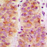 Immunohistochemical analysis of Focal Adhesion Kinase staining in human breast cancer formalin fixed paraffin embedded tissue section. The section was pre-treated using heat mediated antigen retrieval with sodium citrate buffer (pH 6.0). The section was then incubated with the antibody at room temperature and detected using an HRP conjugated compact polymer system. DAB was used as the chromogen. The section was then counterstained with haematoxylin and mounted with DPX. -