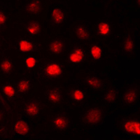 Immunofluorescent analysis of RB1 staining in COLO205 cells. Formalin-fixed cells were permeabilized with 0.1% Triton X-100 in TBS for 5-10 minutes and blocked with 3% BSA-PBS for 30 minutes at room temperature. Cells were probed with the primary antibody in 3% BSA-PBS and incubated overnight at 4 °C in a humidified chamber. Cells were washed with PBST and incubated with a DyLight 594-conjugated secondary antibody (red) in PBS at room temperature in the dark.