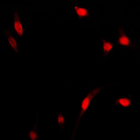 Immunofluorescent analysis of NF-kappaB p65 staining in MCF7 cells. Formalin-fixed cells were permeabilized with 0.1% Triton X-100 in TBS for 5-10 minutes and blocked with 3% BSA-PBS for 30 minutes at room temperature. Cells were probed with the primary antibody in 3% BSA-PBS and incubated overnight at 4 °C in a humidified chamber. Cells were washed with PBST and incubated with a DyLight 594-conjugated secondary antibody (red) in PBS at room temperature in the dark.