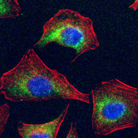 Immunofluorescent analysis of ROCK1 staining in Hela cells. Formalin-fixed cells were permeabilized with 0.1% Triton X-100 in TBS for 5-10 minutes and blocked with 3% BSA-PBS for 30 minutes at room temperature. Cells were probed with the primary antibody in 3% BSA-PBS and incubated overnight at 4 °C in a hidified chamber. Cells were washed with PBST and incubated with a AF488-conjugated secondary antibody (green) in PBS at room temperature in the dark. Phalloidin - AF594 was used to stain Actin filaments (red). DAPI was used to stain the cell nuclei (blue).