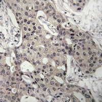 Immunohistochemical analysis of RPL3 staining in human breast cancer formalin fixed paraffin embedded tissue section. The section was pre-treated using heat mediated antigen retrieval with sodium citrate buffer (pH 6.0). The section was then incubated with the antibody at room temperature and detected using an HRP conjugated compact polymer system. DAB was used as the chromogen. The section was then counterstained with haematoxylin and mounted with DPX.