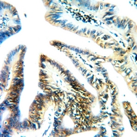 Immunohistochemical analysis of RPS4X staining in human colorectal cancer formalin fixed paraffin embedded tissue section. The section was pre-treated using heat mediated antigen retrieval with sodium citrate buffer (pH 6.0). The section was then incubated with the antibody at room temperature and detected using an HRP conjugated compact polymer system. DAB was used as the chromogen. The section was then counterstained with haematoxylin and mounted with DPX. -
