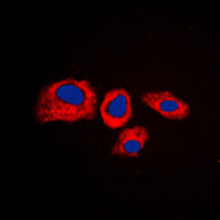 Immunofluorescent analysis of RPS4Y1 staining in K562 cells. Formalin-fixed cells were permeabilized with 0.1% Triton X-100 in TBS for 5-10 minutes and blocked with 3% BSA-PBS for 30 minutes at room temperature. Cells were probed with the primary antibody in 3% BSA-PBS and incubated overnight at 4 °C in a humidified chamber. Cells were washed with PBST and incubated with a DyLight 594-conjugated secondary antibody (red) in PBS at room temperature in the dark. DAPI was used to stain the cell nuclei (blue).