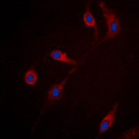 Immunofluorescent analysis of RRAD staining in HepG2 cells. Formalin-fixed cells were permeabilized with 0.1% Triton X-100 in TBS for 5-10 minutes and blocked with 3% BSA-PBS for 30 minutes at room temperature. Cells were probed with the primary antibody in 3% BSA-PBS and incubated overnight at 4 °C in a humidified chamber. Cells were washed with PBST and incubated with a DyLight 594-conjugated secondary antibody (red) in PBS at room temperature in the dark. DAPI was used to stain the cell nuclei (blue).