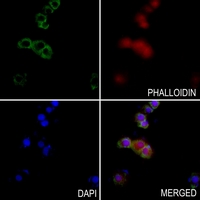 Immunofluorescent analysis of CXCL12 staining in Hela cells. Formalin-fixed cells were permeabilized with 0.1% Triton X-100 in TBS for 5-10 minutes and blocked with 3% BSA-PBS for 30 minutes at room temperature. Cells were probed with the primary antibody in 3% BSA-PBS and incubated overnight at 4 °C in a hidified chamber. Cells were washed with PBST and incubated with a AF488-conjugated secondary antibody (green) in PBS at room temperature in the dark. Phalloidin - AF594 was used to stain Actin filaments (red). DAPI was used to stain the cell nuclei (blue).