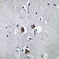 Immunohistochemical analysis of CXCL12 staining in human brain formalin fixed paraffin embedded tissue section. The section was pre-treated using heat mediated antigen retrieval with sodium citrate buffer (pH 6.0). The section was then incubated with the antibody at room temperature and detected using an HRP conjugated compact polymer system. DAB was used as the chromogen. The section was then counterstained with haematoxylin and mounted with DPX. -