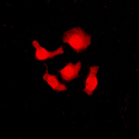Immunofluorescent analysis of SRSF3 staining in HeLa cells. Formalin-fixed cells were permeabilized with 0.1% Triton X-100 in TBS for 5-10 minutes and blocked with 3% BSA-PBS for 30 minutes at room temperature. Cells were probed with the primary antibody in 3% BSA-PBS and incubated overnight at 4 °C in a humidified chamber. Cells were washed with PBST and incubated with a DyLight 594-conjugated secondary antibody (red) in PBS at room temperature in the dark.