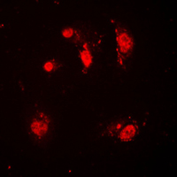 Immunofluorescent analysis of SKP2 staining in HeLa cells. Formalin-fixed cells were permeabilized with 0.1% Triton X-100 in TBS for 5-10 minutes and blocked with 3% BSA-PBS for 30 minutes at room temperature. Cells were probed with the primary antibody in 3% BSA-PBS and incubated overnight at 4 °C in a humidified chamber. Cells were washed with PBST and incubated with a DyLight 594-conjugated secondary antibody (red) in PBS at room temperature in the dark.