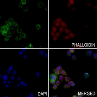 Immunofluorescent analysis of MCT8 staining in Hela cells. Formalin-fixed cells were permeabilized with 0.1% Triton X-100 in TBS for 5-10 minutes and blocked with 3% BSA-PBS for 30 minutes at room temperature. Cells were probed with the primary antibody in 3% BSA-PBS and incubated overnight at 4 °C in a hidified chamber. Cells were washed with PBST and incubated with a AF488-conjugated secondary antibody (green) in PBS at room temperature in the dark. Phalloidin - AF594 was used to stain Actin filaments (red). DAPI was used to stain the cell nuclei (blue).