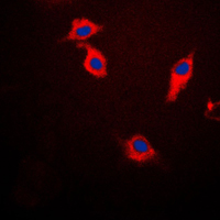 Immunofluorescent analysis of Beta-synuclein staining in HeLa cells. Formalin-fixed cells were permeabilized with 0.1% Triton X-100 in TBS for 5-10 minutes and blocked with 3% BSA-PBS for 30 minutes at room temperature. Cells were probed with the primary antibody in 3% BSA-PBS and incubated overnight at 4 °C in a humidified chamber. Cells were washed with PBST and incubated with a DyLight 594-conjugated secondary antibody (red) in PBS at room temperature in the dark. DAPI was used to stain the cell nuclei (blue).