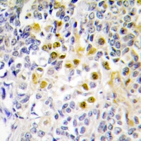 Immunohistochemical analysis of LKB1 (Phospho-S428) staining in human lung cancer formalin fixed paraffin embedded tissue section. The section was pre-treated using heat mediated antigen retrieval with sodium citrate buffer (pH 6.0). The section was then incubated with the antibody at room temperature and detected using an HRP conjugated compact polymer system. DAB was used as the chromogen. The section was then counterstained with haematoxylin and mounted with DPX. -