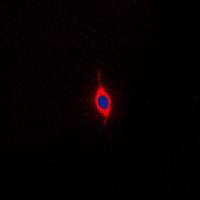 Immunofluorescent analysis of SURF1 staining in Jurkat cells. Formalin-fixed cells were permeabilized with 0.1% Triton X-100 in TBS for 5-10 minutes and blocked with 3% BSA-PBS for 30 minutes at room temperature. Cells were probed with the primary antibody in 3% BSA-PBS and incubated overnight at 4 °C in a humidified chamber. Cells were washed with PBST and incubated with a DyLight 594-conjugated secondary antibody (red) in PBS at room temperature in the dark. DAPI was used to stain the cell nuclei (blue).