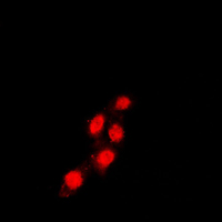 Immunofluorescent analysis of TEAD1 staining in Raw264.7 cells. Formalin-fixed cells were permeabilized with 0.1% Triton X-100 in TBS for 5-10 minutes and blocked with 3% BSA-PBS for 30 minutes at room temperature. Cells were probed with the primary antibody in 3% BSA-PBS and incubated overnight at 4 °C in a humidified chamber. Cells were washed with PBST and incubated with a DyLight 594-conjugated secondary antibody (red) in PBS at room temperature in the dark.