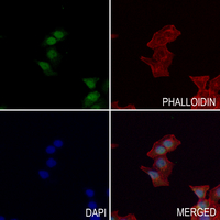 Immunofluorescent analysis of THRB staining in MCF7 cells. Formalin-fixed cells were permeabilized with 0.1% Triton X-100 in TBS for 5-10 minutes and blocked with 3% BSA-PBS for 30 minutes at room temperature. Cells were probed with the primary antibody in 3% BSA-PBS and incubated overnight at 4 °C in a hidified chamber. Cells were washed with PBST and incubated with a AF488-conjugated secondary antibody (green) in PBS at room temperature in the dark. Phalloidin - AF594 was used to stain Actin filaments (red). DAPI was used to stain the cell nuclei (blue).