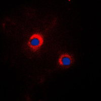Immunofluorescent analysis of GRP94 staining in NIH3T3 cells. Formalin-fixed cells were permeabilized with 0.1% Triton X-100 in TBS for 5-10 minutes and blocked with 3% BSA-PBS for 30 minutes at room temperature. Cells were probed with the primary antibody in 3% BSA-PBS and incubated overnight at 4 °C in a humidified chamber. Cells were washed with PBST and incubated with a DyLight 594-conjugated secondary antibody (red) in PBS at room temperature in the dark. DAPI was used to stain the cell nuclei (blue).