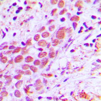 Immunohistochemical analysis of USF2 staining in human breast cancer formalin fixed paraffin embedded tissue section. The section was pre-treated using heat mediated antigen retrieval with sodium citrate buffer (pH 6.0). The section was then incubated with the antibody at room temperature and detected using an HRP conjugated compact polymer system. DAB was used as the chromogen. The section was then counterstained with haematoxylin and mounted with DPX.