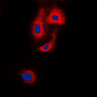 Immunofluorescent analysis of VASP staining in HepG2 cells. Formalin-fixed cells were permeabilized with 0.1% Triton X-100 in TBS for 5-10 minutes and blocked with 3% BSA-PBS for 30 minutes at room temperature. Cells were probed with the primary antibody in 3% BSA-PBS and incubated overnight at 4 °C in a humidified chamber. Cells were washed with PBST and incubated with a DyLight 594-conjugated secondary antibody (red) in PBS at room temperature in the dark. DAPI was used to stain the cell nuclei (blue).