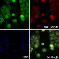 Immunofluorescent analysis of VCP staining in Hela cells. Formalin-fixed cells were permeabilized with 0.1% Triton X-100 in TBS for 5-10 minutes and blocked with 3% BSA-PBS for 30 minutes at room temperature. Cells were probed with the primary antibody in 3% BSA-PBS and incubated overnight at 4 °C in a hidified chamber. Cells were washed with PBST and incubated with a AF488-conjugated secondary antibody (green) in PBS at room temperature in the dark. Phalloidin - AF594 was used to stain Actin filaments (red). DAPI was used to stain the cell nuclei (blue).
