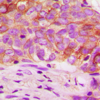 Immunohistochemical analysis of Ezrin (Phospho-T567) staining in human breast cancer formalin fixed paraffin embedded tissue section. The section was pre-treated using heat mediated antigen retrieval with sodium citrate buffer (pH 6.0). The section was then incubated with the antibody at room temperature and detected using an HRP conjugated compact polymer system. DAB was used as the chromogen. The section was then counterstained with haematoxylin and mounted with DPX.