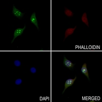 Immunofluorescent analysis of Vimentin staining in CLIP2 cells. Formalin-fixed cells were permeabilized with 0.1% Triton X-100 in TBS for 5-10 minutes and blocked with 3% BSA-PBS for 30 minutes at room temperature. Cells were probed with the primary antibody in 3% BSA-PBS and incubated overnight at 4 °C in a humidified chamber. Cells were washed with PBST and incubated with a AF488-conjugated secondary antibody (green) in PBS at room temperature in the dark. DAPI was used to stain the cell nuclei (blue).