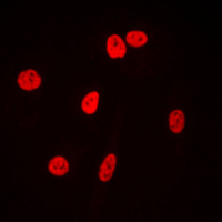 产品描述:Rabbit polyclonal antibody to Ku80免疫原:KLH-conjugated synthetic peptide encompassing a sequence within the C-term region of human Ku80. The exact sequence is proprietary.纯化方式:The antibody was purified by immunogen affinity chromatography.克隆类型:Polyclonal产品形式:Liquid in 0.42% Potassium phosphate, 0.87% Sodium chloride, pH 7.3, 30% glycerol, and 0.01% sodium azide.稀释比:WB (1/500 - 1/1000), IH (1/100 - 1/200), IF/IC (1/100 - 1/500)基因名称:XRCC5相关名称:G22P2; X-ray repair cross-complementing protein 5; 86 kDa subunit of Ku antigen; ATP-dependent DNA helicase 2 subunit 2; ATP-dependent DNA helicase II 80 kDa subunit; CTC box-binding factor 85 kDa subunit; CTC85; CTCBF; DNA repair protein XRCC5; Ku80; Ku86; Lupus Ku autoantigen protein p86; Nuclear factor IV; Thyroid-lupus autoantigen; TLAA; X-ray repair complementing defective repair in Chinese hamster cells 5 (double-strand-break rejoining)