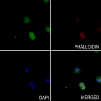 Immunofluorescent analysis of mTERF staining in Hela cells. Formalin-fixed cells were permeabilized with 0.1% Triton X-100 in TBS for 5-10 minutes and blocked with 3% BSA-PBS for 30 minutes at room temperature. Cells were probed with the primary antibody in 3% BSA-PBS and incubated overnight at 4 °C in a hidified chamber. Cells were washed with PBST and incubated with a AF488-conjugated secondary antibody (green) in PBS at room temperature in the dark. Phalloidin - AF594 was used to stain Actin filaments (red). DAPI was used to stain the cell nuclei (blue).
