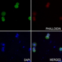 Immunofluorescent analysis of PSCA staining in Hela cells. Formalin-fixed cells were permeabilized with 0.1% Triton X-100 in TBS for 5-10 minutes and blocked with 3% BSA-PBS for 30 minutes at room temperature. Cells were probed with the primary antibody in 3% BSA-PBS and incubated overnight at 4 °C in a hidified chamber. Cells were washed with PBST and incubated with a AF488-conjugated secondary antibody (green) in PBS at room temperature in the dark. Phalloidin - AF594 was used to stain Actin filaments (red). DAPI was used to stain the cell nuclei (blue).