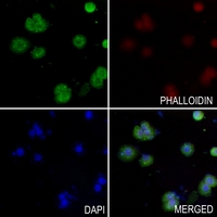 Immunofluorescent analysis of LZTR1 staining in Hela cells. Formalin-fixed cells were permeabilized with 0.1% Triton X-100 in TBS for 5-10 minutes and blocked with 3% BSA-PBS for 30 minutes at room temperature. Cells were probed with the primary antibody in 3% BSA-PBS and incubated overnight at 4 °C in a hidified chamber. Cells were washed with PBST and incubated with a AF488-conjugated secondary antibody (green) in PBS at room temperature in the dark. Phalloidin - AF594 was used to stain Actin filaments (red). DAPI was used to stain the cell nuclei (blue).