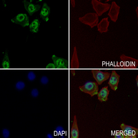 Immunofluorescent analysis of AKAP17A staining in MCF7 cells. Formalin-fixed cells were permeabilized with 0.1% Triton X-100 in TBS for 5-10 minutes and blocked with 3% BSA-PBS for 30 minutes at room temperature. Cells were probed with the primary antibody in 3% BSA-PBS and incubated overnight at 4 °C in a hidified chamber. Cells were washed with PBST and incubated with a AF488-conjugated secondary antibody (green) in PBS at room temperature in the dark. Phalloidin - AF594 was used to stain Actin filaments (red). DAPI was used to stain the cell nuclei (blue).
