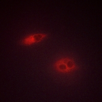 Immunofluorescent analysis of Dysferlin staining in HeLa cells. Formalin-fixed cells were permeabilized with 0.1% Triton X-100 in TBS for 5-10 minutes and blocked with 3% BSA-PBS for 30 minutes at room temperature. Cells were probed with the primary antibody in 3% BSA-PBS and incubated overnight at 4 °C in a hidified chamber. Cells were washed with PBST and incubated with a AF594-conjugated secondary antibody (red) in PBS at room temperature in the dark.