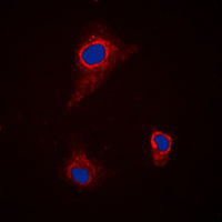 Immunofluorescent analysis of SLC43A1 staining in H9C2 cells. Formalin-fixed cells were permeabilized with 0.1% Triton X-100 in TBS for 5-10 minutes and blocked with 3% BSA-PBS for 30 minutes at room temperature. Cells were probed with the primary antibody in 3% BSA-PBS and incubated overnight at 4 °C in a humidified chamber. Cells were washed with PBST and incubated with a DyLight 594-conjugated secondary antibody (red) in PBS at room temperature in the dark. DAPI was used to stain the cell nuclei (blue).