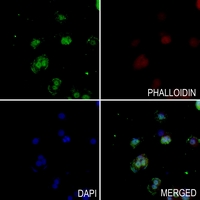 Immunofluorescent analysis of RPC staining in Hela cells. Formalin-fixed cells were permeabilized with 0.1% Triton X-100 in TBS for 5-10 minutes and blocked with 3% BSA-PBS for 30 minutes at room temperature. Cells were probed with the primary antibody in 3% BSA-PBS and incubated overnight at 4 °C in a hidified chamber. Cells were washed with PBST and incubated with a AF488-conjugated secondary antibody (green) in PBS at room temperature in the dark. Phalloidin - AF594 was used to stain Actin filaments (red). DAPI was used to stain the cell nuclei (blue).