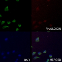 Immunofluorescent analysis of STAM2 (Phospho-Y192) staining in A2780 cells. Formalin-fixed cells were permeabilized with 0.1% Triton X-100 in TBS for 5-10 minutes and blocked with 3% BSA-PBS for 30 minutes at room temperature. Cells were probed with the primary antibody in 3% BSA-PBS and incubated overnight at 4 °C in a hidified chamber. Cells were washed with PBST and incubated with a AF488-conjugated secondary antibody (green) in PBS at room temperature in the dark. Phalloidin - AF594 was used to stain Actin filaments (red). DAPI was used to stain the cell nuclei (blue).
