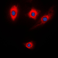 Immunofluorescent analysis of Kalirin staining in NIH3T3 cells. Formalin-fixed cells were permeabilized with 0.1% Triton X-100 in TBS for 5-10 minutes and blocked with 3% BSA-PBS for 30 minutes at room temperature. Cells were probed with the primary antibody in 3% BSA-PBS and incubated overnight at 4 °C in a humidified chamber. Cells were washed with PBST and incubated with a DyLight 594-conjugated secondary antibody (red) in PBS at room temperature in the dark. DAPI was used to stain the cell nuclei (blue).
