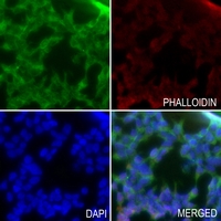 Immunofluorescent analysis of KCNAB3 staining in HEK293T cells. Formalin-fixed cells were permeabilized with 0.1% Triton X-100 in TBS for 5-10 minutes and blocked with 3% BSA-PBS for 30 minutes at room temperature. Cells were probed with the primary antibody in 3% BSA-PBS and incubated overnight at 4 °C in a hidified chamber. Cells were washed with PBST and incubated with a AF488-conjugated secondary antibody (green) in PBS at room temperature in the dark. Phalloidin - AF594 was used to stain Actin filaments (red). DAPI was used to stain the cell nuclei (blue).