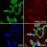 Immunofluorescent analysis of B4GALT5 staining in HEK293T cells. Formalin-fixed cells were permeabilized with 0.1% Triton X-100 in TBS for 5-10 minutes and blocked with 3% BSA-PBS for 30 minutes at room temperature. Cells were probed with the primary antibody in 3% BSA-PBS and incubated overnight at 4 °C in a hidified chamber. Cells were washed with PBST and incubated with a AF488-conjugated secondary antibody (green) in PBS at room temperature in the dark. Phalloidin - AF594 was used to stain Actin filaments (red). DAPI was used to stain the cell nuclei (blue).