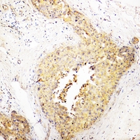 Immunohistochemical analysis of COX5A staining in human breast cancer formalin fixed paraffin embedded tissue section. The section was pre-treated using heat mediated antigen retrieval with sodium citrate buffer (pH 6.0). The section was then incubated with the antibody at room temperature and detected using an HRP conjugated compact polymer system. DAB was used as the chromogen. The section was then counterstained with haematoxylin and mounted with DPX.