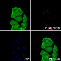 Immunofluorescent analysis of BAGE5 staining in Hela cells. Formalin-fixed cells were permeabilized with 0.1% Triton X-100 in TBS for 5-10 minutes and blocked with 3% BSA-PBS for 30 minutes at room temperature. Cells were probed with the primary antibody in 3% BSA-PBS and incubated overnight at 4 °C in a hidified chamber. Cells were washed with PBST and incubated with a AF488-conjugated secondary antibody (green) in PBS at room temperature in the dark. Phalloidin - AF594 was used to stain Actin filaments (red). DAPI was used to stain the cell nuclei (blue).