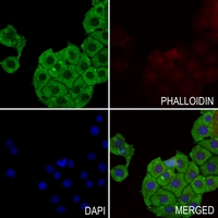Immunofluorescent analysis of ABCG1 staining in Hela cells. Formalin-fixed cells were permeabilized with 0.1% Triton X-100 in TBS for 5-10 minutes and blocked with 3% BSA-PBS for 30 minutes at room temperature. Cells were probed with the primary antibody in 3% BSA-PBS and incubated overnight at 4 °C in a hidified chamber. Cells were washed with PBST and incubated with a AF488-conjugated secondary antibody (green) in PBS at room temperature in the dark. Phalloidin - AF594 was used to stain Actin filaments (red). DAPI was used to stain the cell nuclei (blue).